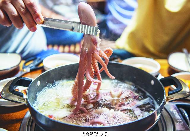 ‘봄 주꾸미, 가을 낙지’라는 말에서도 알 수 있듯 낙지의 제철은 보통 가을이다. 태안의 낙지 요리로 ‘박속밀국낙지탕’이 인기다. 낙지가 들어간 국물 요리를 일컫는 ‘연포탕’과 차이가 있다. 무 대신 하얀 박속과 파 및 고추를 썰어 넣고 국물이 끓어오르면 산낙지를 데쳐 낸다. 살짝 익힌 낙지는 양념장에 찍어 먹는다. 탱탱하고 야들야들한 낙지의 식감이 미각을 사로잡는다. 박은 당질과 단백질, 식이섬유가 많으며 칼슘과 비타민류를 함유하고 있어 영양 보충과 비만 해결에 도움이 된다. 박속에서 우러나는 시원하고 담백한 국물에 칼국수·수제비 등을 넣어 먹는 것이 포인트다. 밀가루로 만든 국물 있는 음식이어서 ‘밀국’이다.