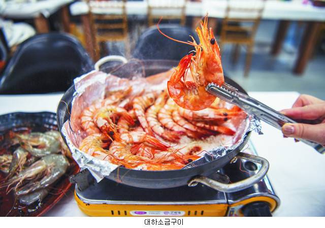 대하는 무쇠 불판에 굵은 소금을 깔고 그 위에 올려 굽는다. 주황색으로 변하면 먹으면 된다. 담백하고 쫄깃한 식감이 침샘을 자극한다. 살아 있는 대하를 회로 먹는 것도 별미다. 초고추장에 찍어 베어 물면 탱글탱글한 대하의 속살이 달콤 쫄깃한 맛으로 입안에서 사르르 녹는다.