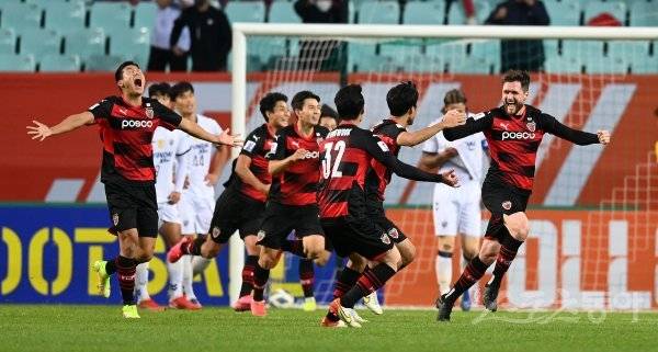 20일 전주월드컵경기장에서 열린 울산과 포항의 2021 아시아축구연맹(AFC) 챔피언스리그(ACL) 4강전에서 포항 그랜트가 동점골을 성공시킨 후 환호하고 있다.