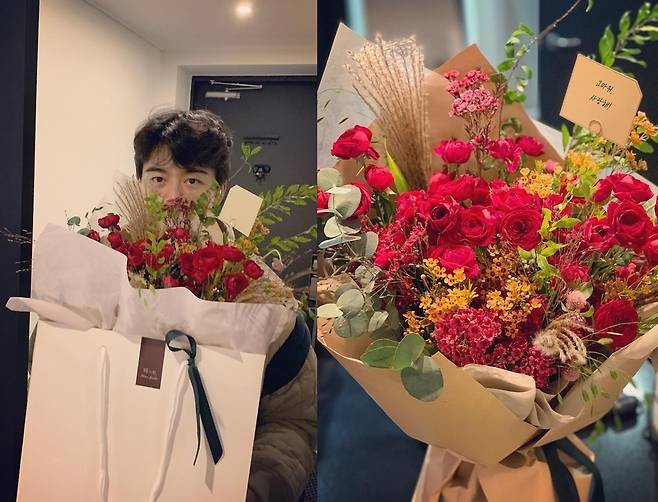 공개된 사진엔 꽃다발을 든 남편 홍성기의 모습이 담겼다. 결혼기념일을 축하하며 '고마워 사랑해'라는 짧은 쪽지와 함께 이현이에게 꽃다발을 선물한 것으로 보인다.
