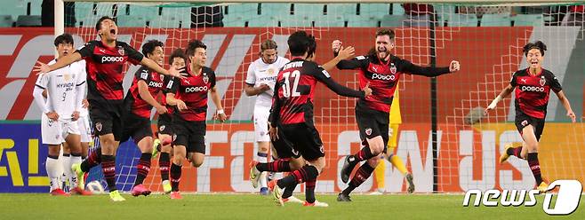 (전주=뉴스1) 유경석 기자 = 20일 전북 전주시 전주월드컵경기장에서 열린 '2021 아시아축구연맹(AFC) 챔피언스리그(ACL) 4강전 울산 현대와 포항 스틸러스의 경기에서 포항 그랜트가 동점골을 넣은 후 환호하고 있다. 2021.10.20/뉴스1