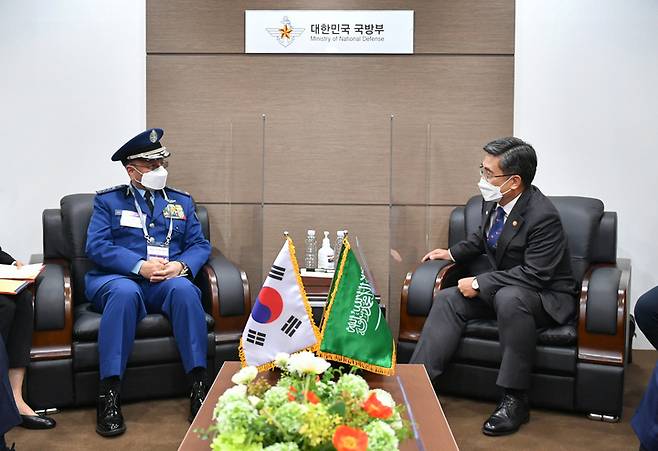 [서울=뉴시스] 서욱 국방부장관이 20일 서울 ADEX 2021 계기 사우디아라비아군 총참모장과 접견하고 있다. (사진=국방부 제공) 2021.10.20. photo@newsis.com *재판매 및 DB 금지