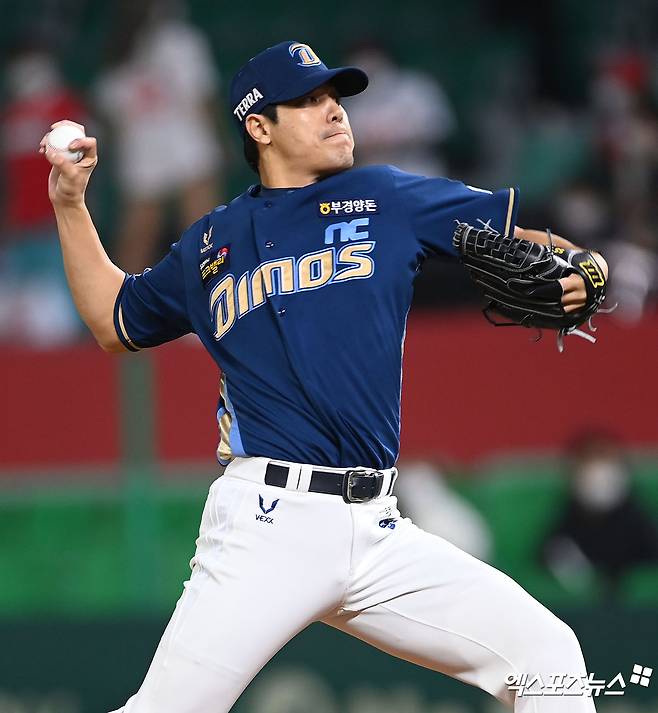 (엑스포츠뉴스 인천, 김한준 기자) 20일 오후 인천 SSG랜더스필드에서 열린 '2021 신한은행 SOL KBO리그' NC 다이노스와 SSG 랜더스의 경기, 8회말 NC 김진성이 공을 힘차게 던지고 있다.