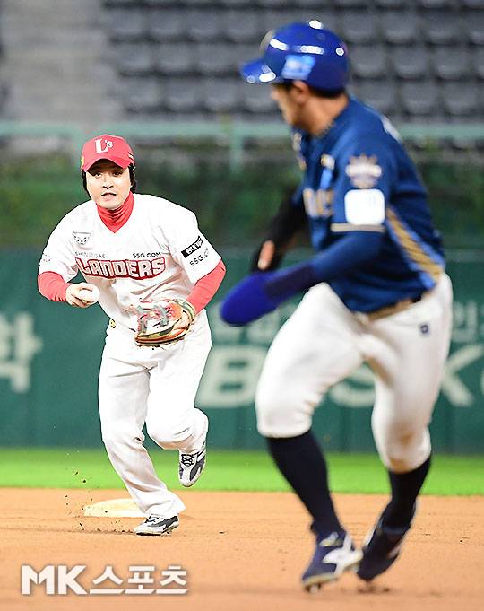 8회초 1사에서 SSG 김성현 2루수가 런다운에 걸린 1루주자 NC 대주자 김기환을 쫓고 있다.