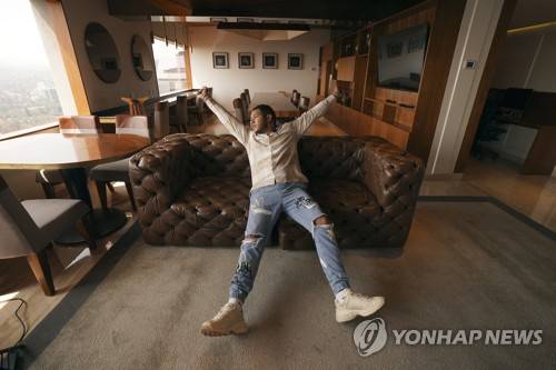 Panamanian singer and songwriter Humberto Ceballos Boza, also known as Boza, stretches on the sidelines of an interview at a hotel in Mexico City, Friday, Oct. 15, 2021. Boza is nominated to the Latin Grammy in the coveted best new artist category. (AP Photo / Marco Ugarte)