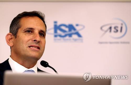 epa09534111 Brigadier General (Res.) Uri Oron, Director General of the Israel Space Agency (ISA) speaks during a press conference on the occasion of the Space Week at Expo 2020 Dubai in Gulf emirate of Dubai, United Arab Emirates, 20 October 2021. The Israel Ministry of Innovation, Science and Technology hosted a press conference at the Israeli Pavilion during the Expo 2020 Dubai to provide information on the cooperation agreement with the UAE Space Agency, the mutual cooperation on the Beresheet Mission and the mutual cooperation on the Venus satellite. EPA/ALI HAIDER