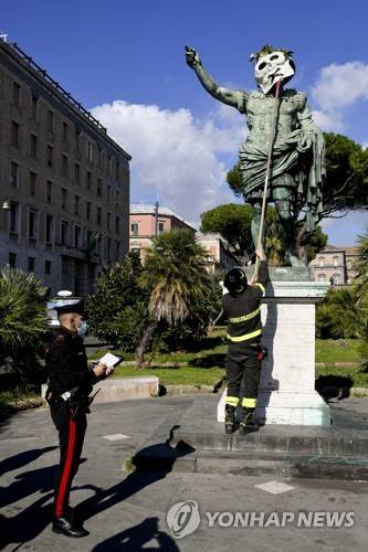 epa09534119 Italian Carabinieri removed one of several papier-mache skulls with an 'X' made with black adhesive tape and adorned with a crown of pine needles on the head, placed by unknown people in the night over numerous statues of the city center of Naples, Italy, 21 October 2021. EPA/Ciro Fusco