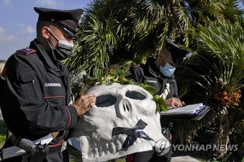 epa09534121 Italian Carabinieri removed one of several papier-mache skulls with an 'X' made with black adhesive tape and adorned with a crown of pine needles on the head, placed by unknown people in the night over numerous statues of the city center of Naples, Italy, 21 October 2021. EPA/Ciro Fusco