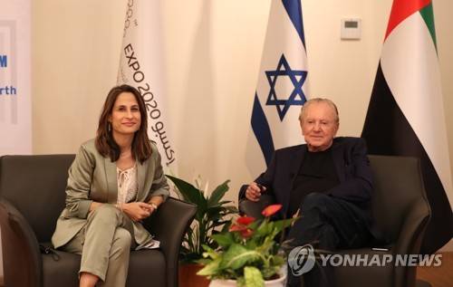 epa09534143 (L-R) Orit Farkash-Hacohen, Israeli Minister of Innovation, Science & Technology and South African-born Israeli billionaire Morris Kahn attend a press conference on the occasion of the Space Week at Expo 2020 Dubai in Gulf emirate of Dubai, United Arab Emirates, 20 October 2021. The Israel Ministry of Innovation, Science and Technology hosted a press conference at the Israeli Pavilion during the Expo 2020 Dubai to provide information on the cooperation agreement with the UAE Space Agency, the mutual cooperation on the Beresheet Mission and the mutual cooperation on the Venus satellite. EPA/ALI HAIDER