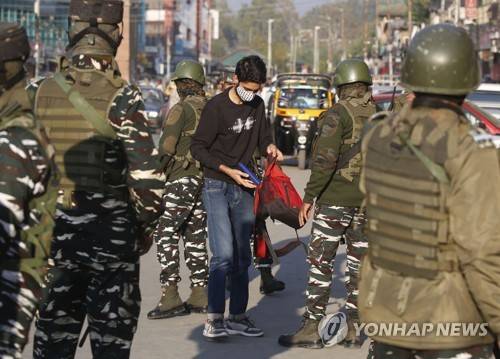 epa09534147 An Indian paramilitary soldier checks a bag of a Kashmiri man during surprise frisking in main city center Lal Chowk in Srinagar, the summer capital of Indian Kashmir, 20 October 2021. Security has been beefed up in Indian Kashmir following the killings of non-local labourers. Eleven civilians, including five non-locals and three minority community members have been killed by unidentified gunmen in targeted attacks during the past two weeks. EPA/FAROOQ KHAN