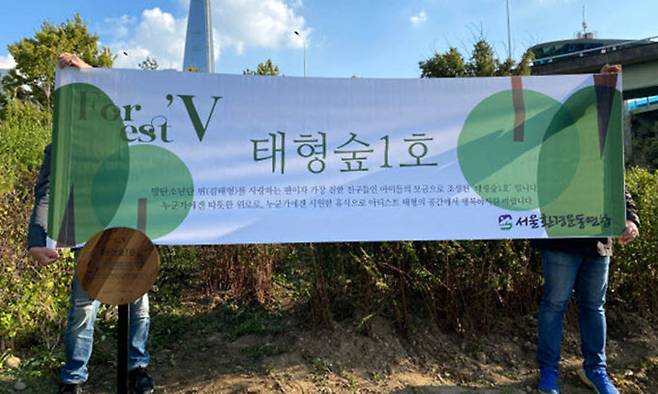 서울환경운동연합은 20일 뷔의 팬 170여명과 함께 전날 서울 잠실 한강공원 잠실대교 부근에서 뷔의 본명을 딴 '태형 숲 1호'(사진)를 조성했다고 밝혔다.