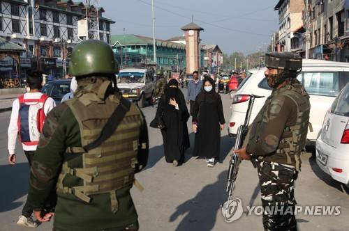 epa09534150 Indian paramilitary soldiers stand guard as Kashmiri women walk past during surprise frisking in main city center Lal Chowk in Srinagar, the summer capital of Indian Kashmir, 20 October 2021. Security has been beefed up in Indian Kashmir following the killings of non-local labourers. Eleven civilians, including five non-locals and three minority community members have been killed by unidentified gunmen in targeted attacks during the past two weeks. EPA/FAROOQ KHAN