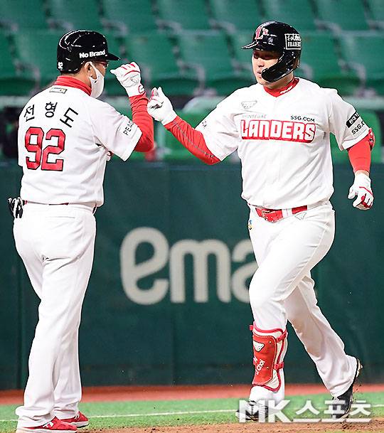 8회말 1사 1, 3루에서 SSG 최정이 NC 바뀐투수 이용찬을 상대로 7-7 동점을 만드는 극적인 동점 스리런홈런을 치고 전형도 코치와 하이파이브를 하고 있다.