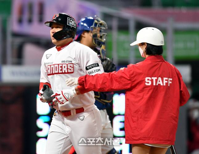 SSG 3번타자 최정이 20일 랜더스필드에서 열린 2021프로야구 SSG랜더스와 NC다이노스의 경기 8회말 1사 1,3루에서 동점 스리런 홈런을 터트린 후 홈인하고 있다. 2021.10.20.