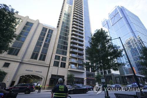 A police officer stands near the entrance of a residential building, Wednesday, Oct. 20, 2021, in Atlanta. Police in Atlanta have closed streets around at least four square blocks of office and apartment buildings in response to gunfire in the city's midtown area. (AP Photo/Brynn Anderson)
