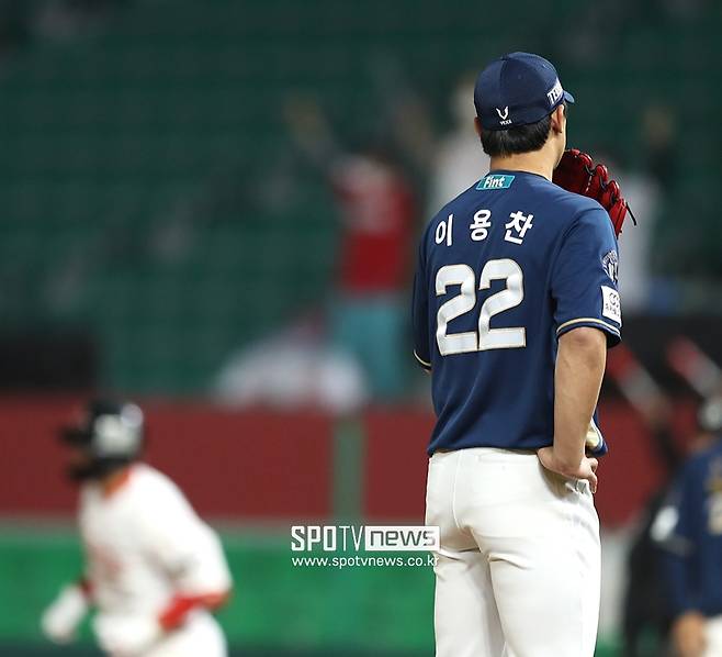 [스포티비뉴스=인천, 곽혜미 기자] 2021 신한은행 SOL KBO리그 SSG 랜더스와 NC 다이노스의 경기가 20일 오후 인천 SSG랜더스필드에서 열렸다. 8회말 1사 1,3루 상황에서 SSG 최정에게 동점 스리런을 허용한 NC 이용찬이 아쉬워하고 있다.