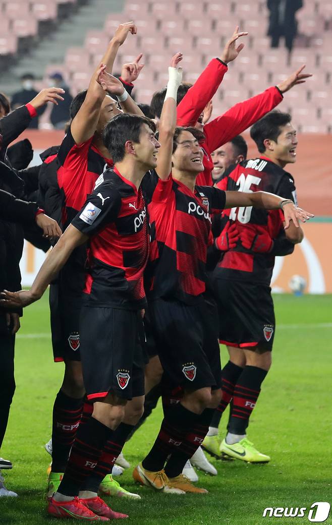 (전주=뉴스1) 유경석 기자 = 20일 전북 전주시 전주월드컵경기장에서 열린 '2021 아시아축구연맹(AFC) 챔피언스리그(ACL) 4강전 울산 현대와 포항 스틸러스의 경기에서 승부차기 끝에 승리한 포항 선수들이 기쁨을 만끽하고 있다. 2021.10.20/뉴스1