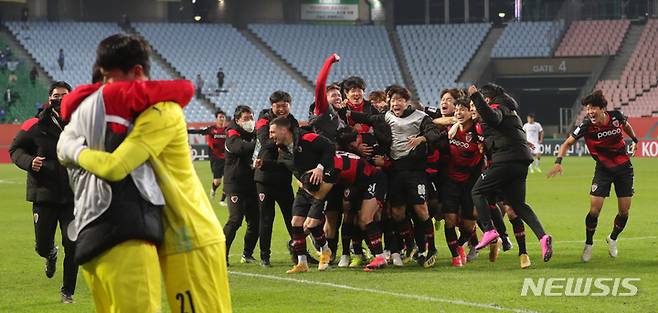 [전주=뉴시스] 김얼 기자 = 2021 아시아축구연맹(AFC) 챔피언스리그(ACL) 4강전 울산 현대와 포항 스틸러스의 경기가 열린 17일 전북 전주시 전주월드컵경기장에서 경기에 이긴 포항 스틸러스 선수들이 자축하고 있다. 2021.10.20. pmkeul@newsis.com