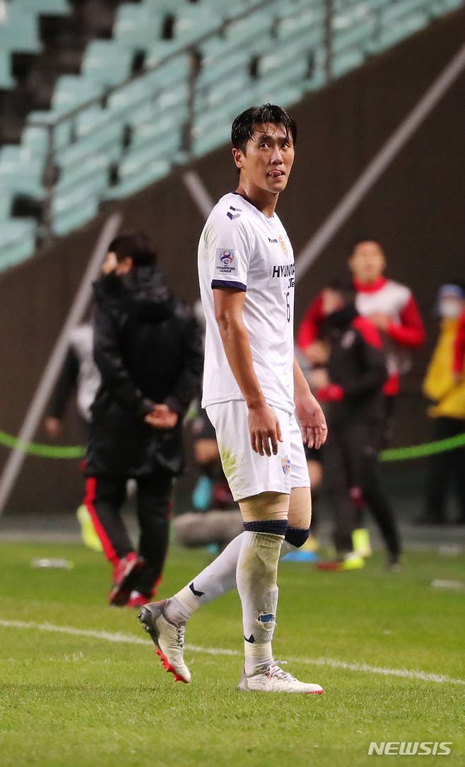 [전주=뉴시스] 김얼 기자 = 2021 아시아축구연맹(AFC) 챔피언스리그(ACL) 4강전 울산 현대와 포항 스틸러스의 경기가 열린 17일 전북 전주시 전주월드컵경기장에서 울산 현대 원두재 선수가 레드카드를 받고 퇴장하고 있다. 2021.10.20. pmkeul@newsis.com