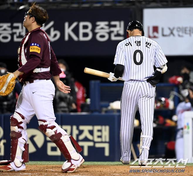 2021 KBO리그 키움 히어로즈와 LG 트윈스의 경기가 20일 잠실야구장에서 열렸다. 9회말 1사 만루 LG 이영빈이 포수 파울플라이로 물러나며 아쉬워하고 있다. 잠실=허상욱 기자 wook@sportschosun.com/2021.10.20/