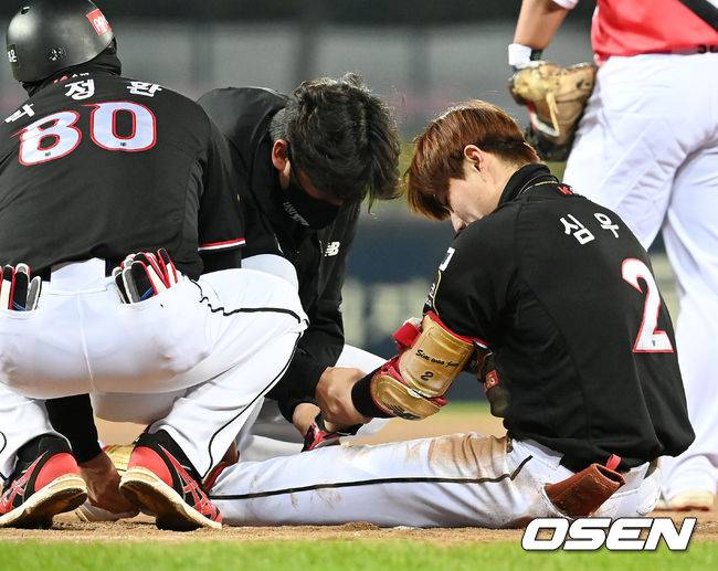 8회초 KT 선두타자 나온 심우준이 기습 번트 후 1루에서 슬라이딩을 하며 아웃된 후 고통을 호소하고 있다. 2021.10.20 / rumi@osen.co.kr