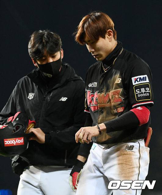 8회초 KT 선두타자 나온 심우준이 기습 번트 후 1루에서 슬라이딩을 하며 아웃된 후 고통을 호소하고 있다. 2021.10.20 / rumi@osen.co.kr