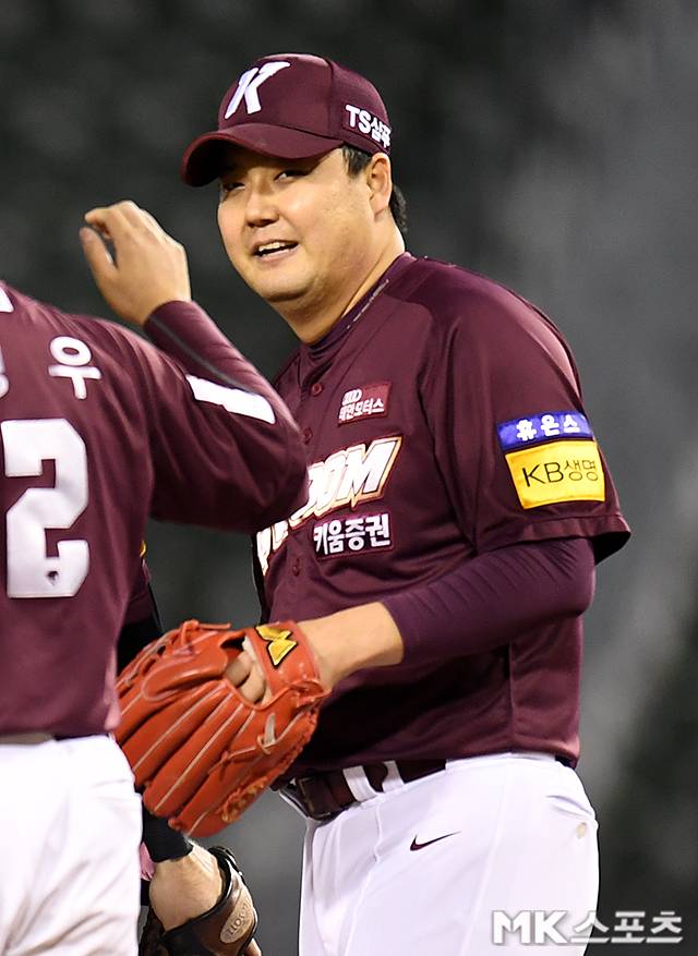 경기에서 승리한 키움 김태훈이 기뻐하고 있다.