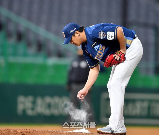 NC 마무리 이용찬이 20일 랜더스필드에서 열린 2021프로야구 SSG랜더스와 NC다이노스의 경기 9회말 수비를 위해 로진가루를 뭍히고 있다. 2021.10.20.