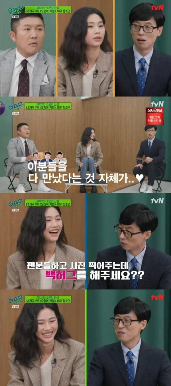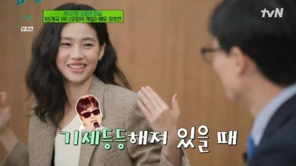 정호연은 '오징어게임'을 통해 배우로 데뷔하자마자 전세계적인 인기를 끌고 있다. 유재석이 근황을 묻자 "오늘도 새벽 3시부터 스케줄을 하고 있다. 지미 펠런쇼 녹화가 오늘이었다"라고 답해 놀라움을 자아냈다.