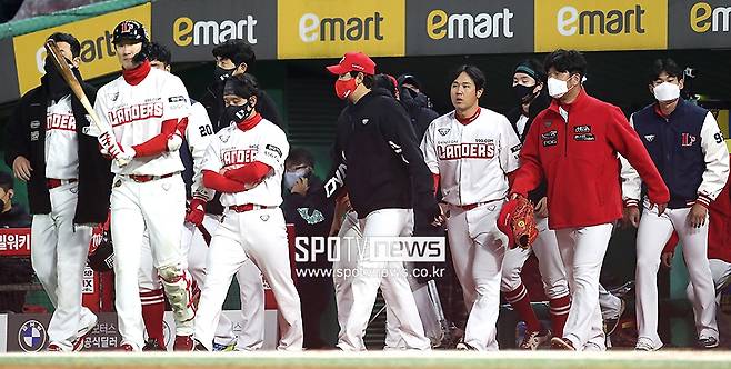 [스포티비뉴스=인천, 곽혜미 기자] 2021 신한은행 SOL KBO리그 SSG 랜더스와 NC 다이노스의 경기가 20일 오후 인천 SSG랜더스필드에서 열렸다. 7-7 무승부를 기록한 SSG 선수들이 아쉬워하고 있다.