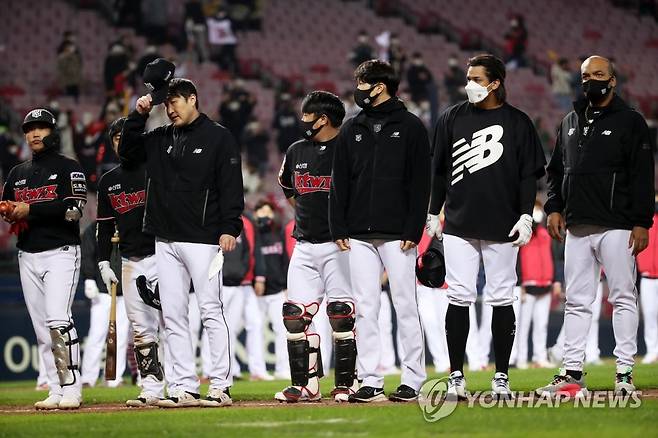 (광주=연합뉴스) 조남수 기자 = 20일 광주-기아챔피언스필드에서 열린 2021 프로야구 kt wiz와 KIA 타이거즈의 경기에서 KIA에 0-3으로 패한 kt 선수들이 관중들에게 인사하기 위해 도열하고 있다. 2021.10.20