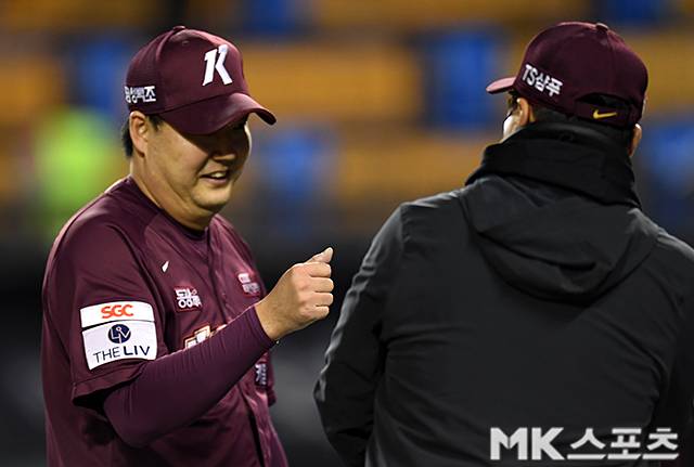 경기에서 승리한 키움 김태훈이 홍원기 감독과 하이파이브 하고 있다.