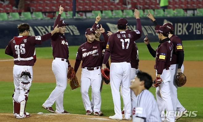 [서울=뉴시스] 이영환 기자 = 20일 오후 서울 송파구 잠실야구장에서 열린 2021 KBO리그 키움 히어로즈와 LG 트윈스의 경기, 9회말 위기를 넘기고 6대5 승리를 거둔 키움 선수들이 기뻐하고 있다. 2021.10.20. 20hwan@newsis.com