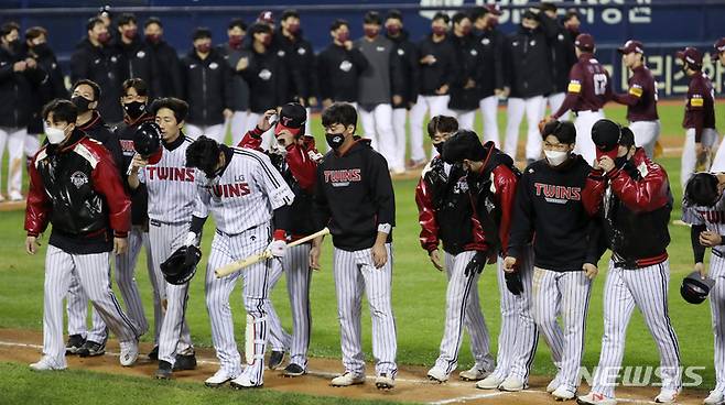 [서울=뉴시스] 이영환 기자 = 20일 오후 서울 송파구 잠실야구장에서 열린 2021 KBO리그 키움 히어로즈와 LG 트윈스의 경기, 9회말 찬스를 살리지 못하고 키움에게 6대5로 패한 LG 선수들이 팬들에게 인사를 하고 있다. 2021.10.20. 20hwan@newsis.com