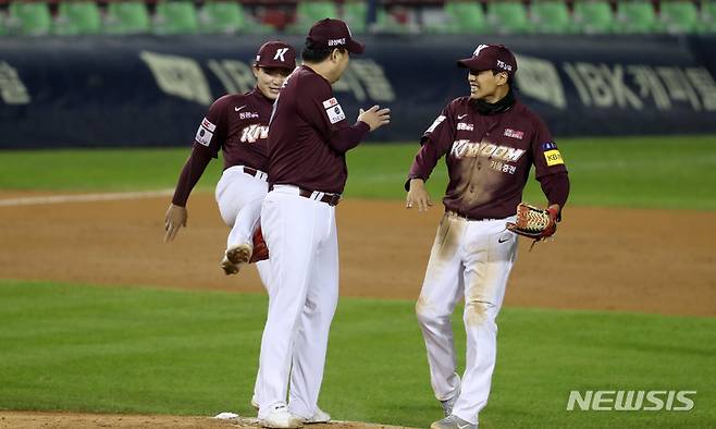 [서울=뉴시스] 이영환 기자 = 20일 오후 서울 송파구 잠실야구장에서 열린 2021 KBO리그 키움 히어로즈와 LG 트윈스의 경기, 9회말 위기를 넘기고 6대5 승리를 지켜낸 키움 마무리 김태훈이 동료들과 대화를 하고 있다. 2021.10.20. 20hwan@newsis.com