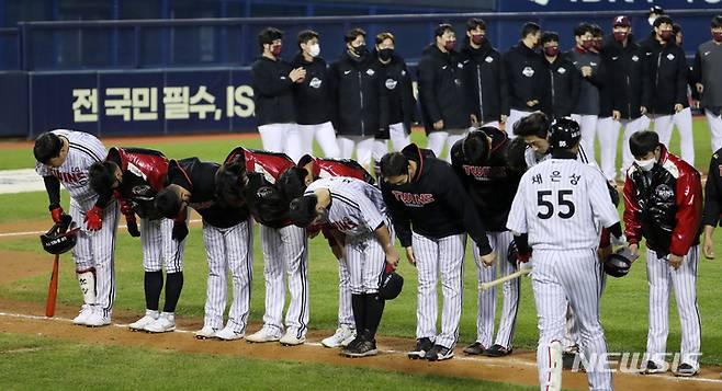 [서울=뉴시스] 이영환 기자 = 20일 오후 서울 송파구 잠실야구장에서 열린 2021 KBO리그 키움 히어로즈와 LG 트윈스의 경기, 9회말 찬스를 살리지 못하고 키움에게 6대5로 패한 LG 선수들이 팬들에게 인사를 하고 있다. 2021.10.20. 20hwan@newsis.com