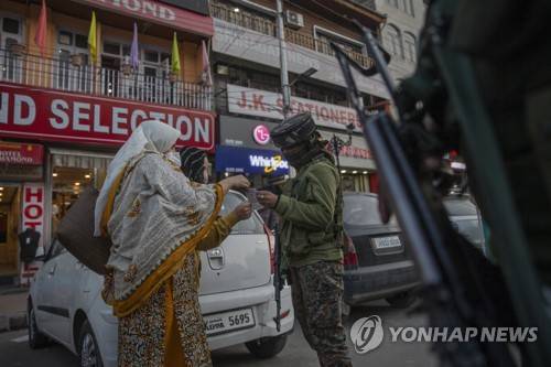 An Indian paramilitary soldier checks the identity cards of Kashmiri women during a surprise check operation in Srinagar, Indian controlled Kashmir, Wednesday, Oct. 20, 2021. Security has been beefed up in the region's main city following a string of targeted killings last week.(AP Photo/Dar Yasin)