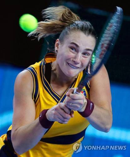 epa09534184 Aryna Sabalenka of Belarus in action against Ajla Tomljanovic of Australia during their women's second round match at the Kremlin Cup tennis tournament in Moscow, Russia, 20 October 2021. EPA/SERGEI ILNITSKY