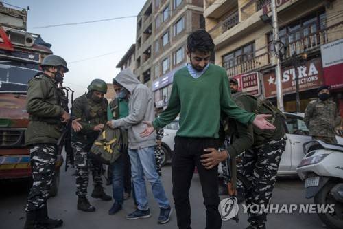Indian paramilitary soldiers frisk Kashmiris during a surprise check operation in Srinagar, Indian controlled Kashmir, Wednesday, Oct. 20, 2021. Security has been beefed up in the region's main city following a string of targeted killings last week.(AP Photo/Dar Yasin)