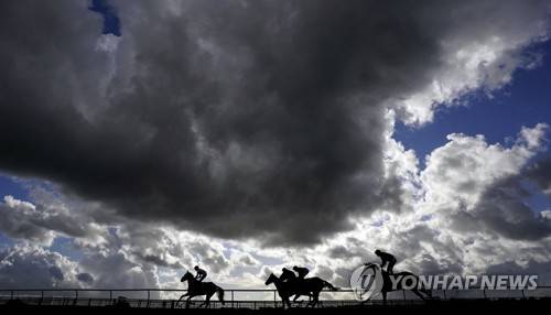 Clouds hang over Claymore ridden by Joe Fanning, left, after winning the Racing TV Novice Stakes at Newmarket Racecourse, England, Wednesday, Oct. 20, 2021. (Tim Goode/PA via AP) UNITED KINGDOM OUT NO SALES NO ARCHIVE PHOTOGRAPH CANNOT BE STORED OR USED FOR MORE THAN 14 DAYS AFTER THE DAY OF TRANSMISSION