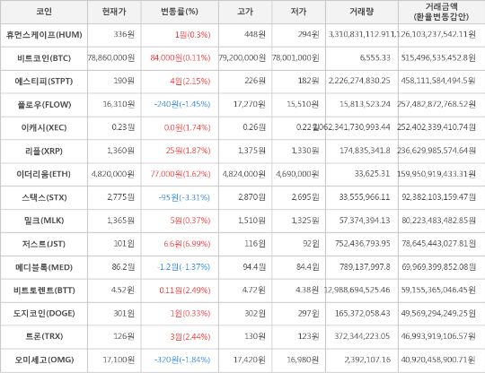 한편 거래금액 기준으로는 휴먼스케이프, 비트코인, 에스티피 순으로 가장 활발한 거래를 보이고 있다.