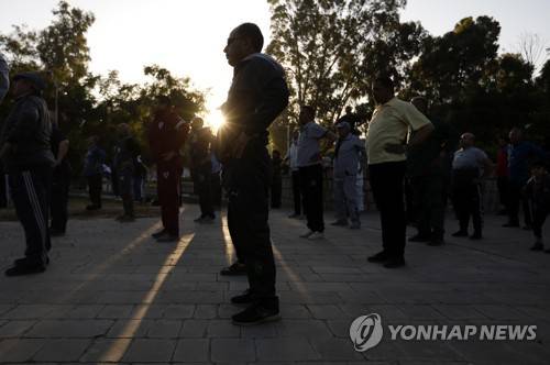 epa09534207 Yemenis perform Swedish exercises at a public park in Sana'a, Yemen, 14 October 2021 (Issued 20 October 2021). More than 200 Yemenis of all ages gather daily at a public park in the capital Sana'a to do joint exercises as a way to keep fit and relieve the psychological stresses brought on by years of war. The participants of the Swedish exercise classes, a system that involves light gymnastics, stretches and calisthenics, set out an hour before sunset to make it to Al-Thawra park in time to start warming up for the workout. A teacher and a number of assistants are on hand to guide them through the different drills. EPA/YAHYA ARHAB