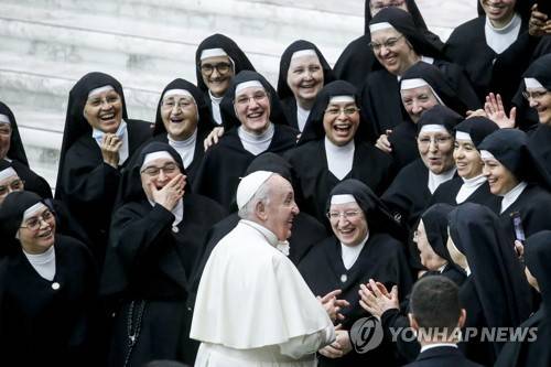 epaselect epa09533754 Pope Francis greets a group of nuns during his weekly General Audience in the Paul VI Audience Hall, in Vatican City, 20 October 2021. EPA/FABIO FRUSTACI