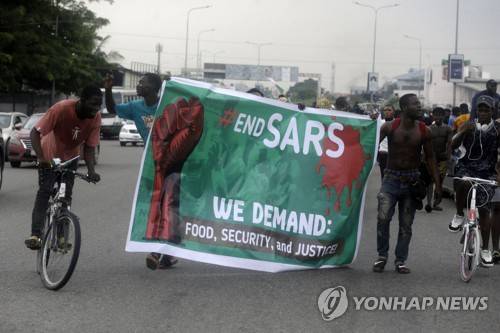 People protest at Lekki Toll plaza in Lagos, Nigeria, Wednesday, Oct. 20, 2021. Nigerian police officers fired tear gas at protesters in Lagos, the country's largest city, as they tried to disperse hundreds of people demonstrating against police brutality on Wednesday. One year ago, thousands marched in Nigeria for the #EndSARS movement to protest the activities of the now-disbanded Special Anti-Robbery Squad, a unit accused of police brutality. (AP Photo/Sunday Alamba)