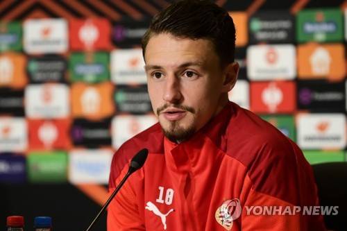 epa09534258 PSV Eindhoven's Olivier Boscagli speaks during a press conference in Eindhoven, Netherlands, 20 October 2021. PSV Eindhoven will face AS Monaco in their UEFA Europa League group stage soccer match on 21 October 2021. EPA/OLAF KRAAK