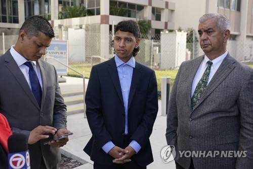 Anthony Borges, center, a survivor of the Parkland school shooting, stands with his father Royer Borges, left, and attorney Alex Arreaza, before talking to reporters before entering the courthouse, Wednesday, Oct. 20, 2021, in Fort Lauderdale, Fla. Nikolas Cruz is expected to plead guilty Wednesday to 17 counts of first-degree murder for the 2018 massacre at Marjory Stoneman Douglas High school in Parkland, Fla. (AP Photo/Wilfredo Lee)