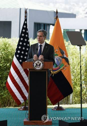 U.S. Secretary of State Antony Blinken speaks to an audience in Quito, Ecuador, Wednesday, Oct. 20, 2021. (Santiago Arcos/Pool via AP) POOL IMAGE