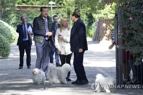 epa09534310 President of 'Forza Italia', Silvio Berlusconi, with Matteo Salvini, leader of 'Lega Nord', and Giorgia Meloni, President of 'Fratelli d'Italia', after a meeting in Berlusconi's residence in Rome, 20 October 2021. EPA/ANSA/CLAUDIO PERI