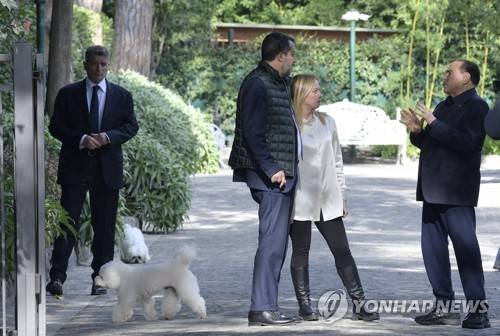 epa09534309 President of 'Forza Italia', Silvio Berlusconi, with Matteo Salvini, leader of 'Lega Nord', and Giorgia Meloni, President of 'Fratelli d'Italia', after a meeting in Berlusconi's residence in Rome, 20 October 2021. EPA/ANSA/CLAUDIO PERI