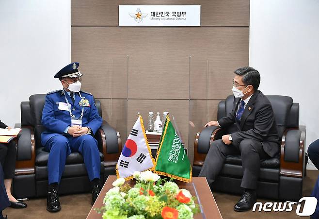 (서울=뉴스1) = 서욱 국방부장관이 20일 ‘서울 국제 항공우주 및 방위산업전시회 2021’참석을 위해 방한한 파야드 빈 하메드 알 루와일리(Fayyadh bin Hamed Al Ruwaili) 사우디 총참모장을 접견하고, 양국 간 주요 국방·방산 현안에 대해 의견을 교환하고 있다. (국방부 제공) 2021.10.20/뉴스1